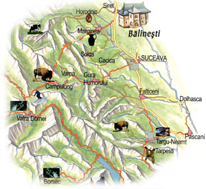 Va oferim o harta desenata cu amplasarea Bisericii Balinesti fata de orasul Siret si principalele obiective turistice ale judetului Suceava.